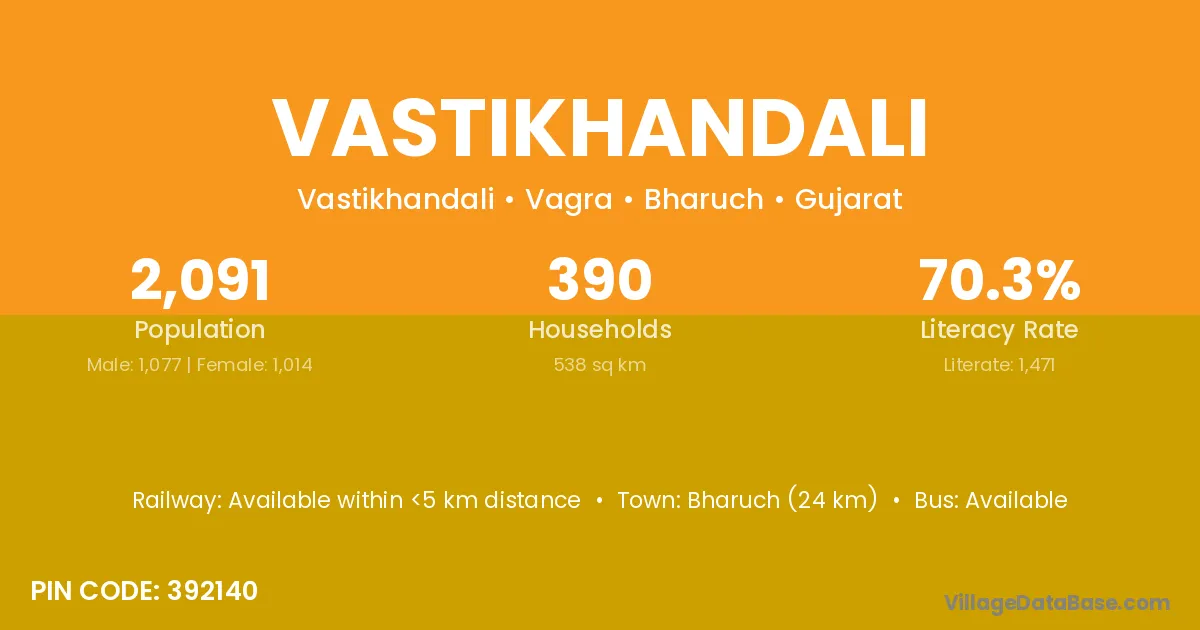 Bharuch (24 km) is the nearest town to Vastikhandali village for major economic activities and is located approximately 24 km away.