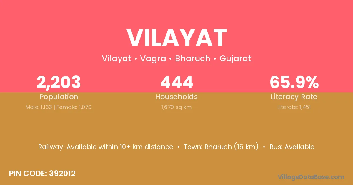 Bharuch (15 km) is the nearest town to Vilayat village for major economic activities and is located approximately 15 km away.