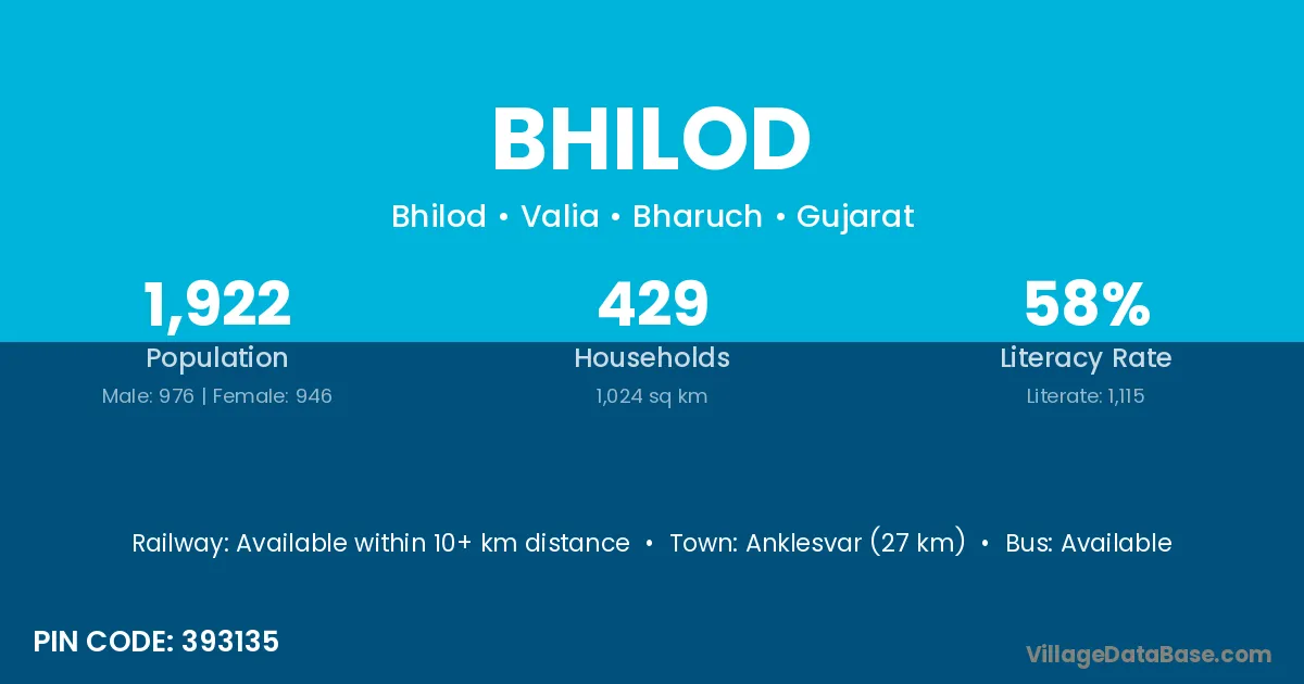 Anklesvar (27 km) is the nearest town to Bhilod village for major economic activities and is located approximately 27 km away.