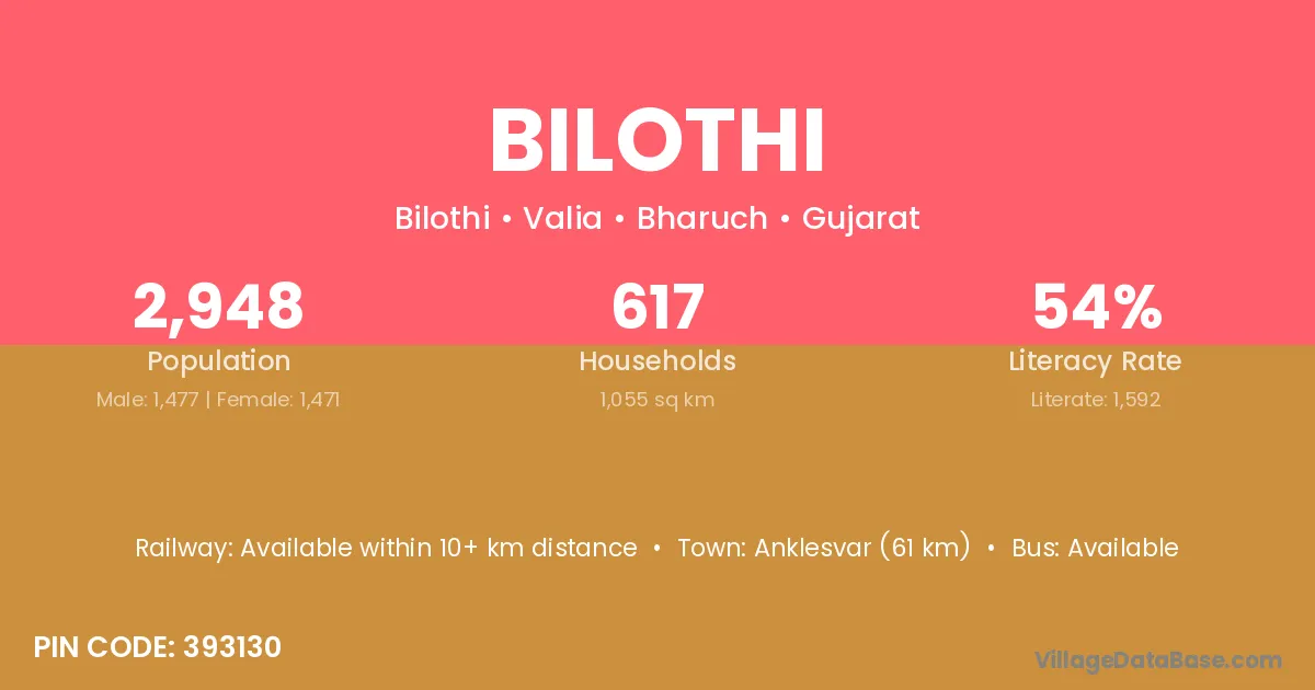 Anklesvar (61 km) is the nearest town to Bilothi village for major economic activities and is located approximately 61 km away.