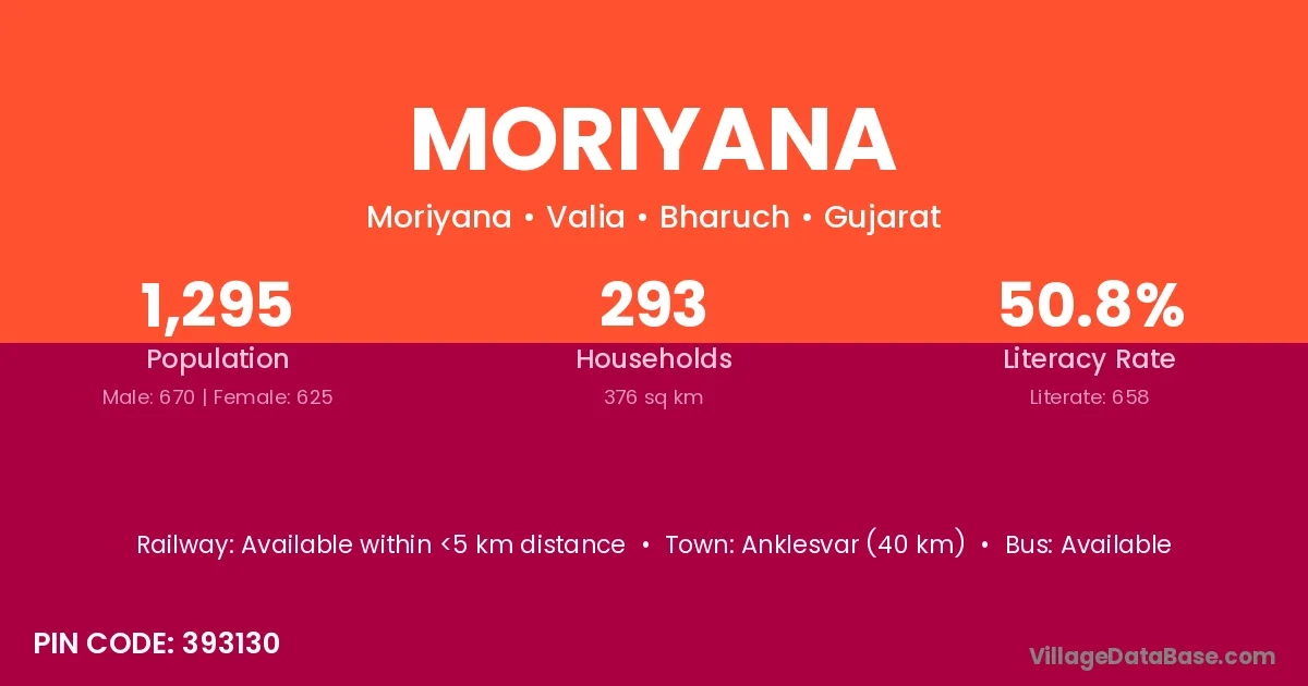 Anklesvar (40 km) is the nearest town to Moriyana village for major economic activities and is located approximately 40 km away.