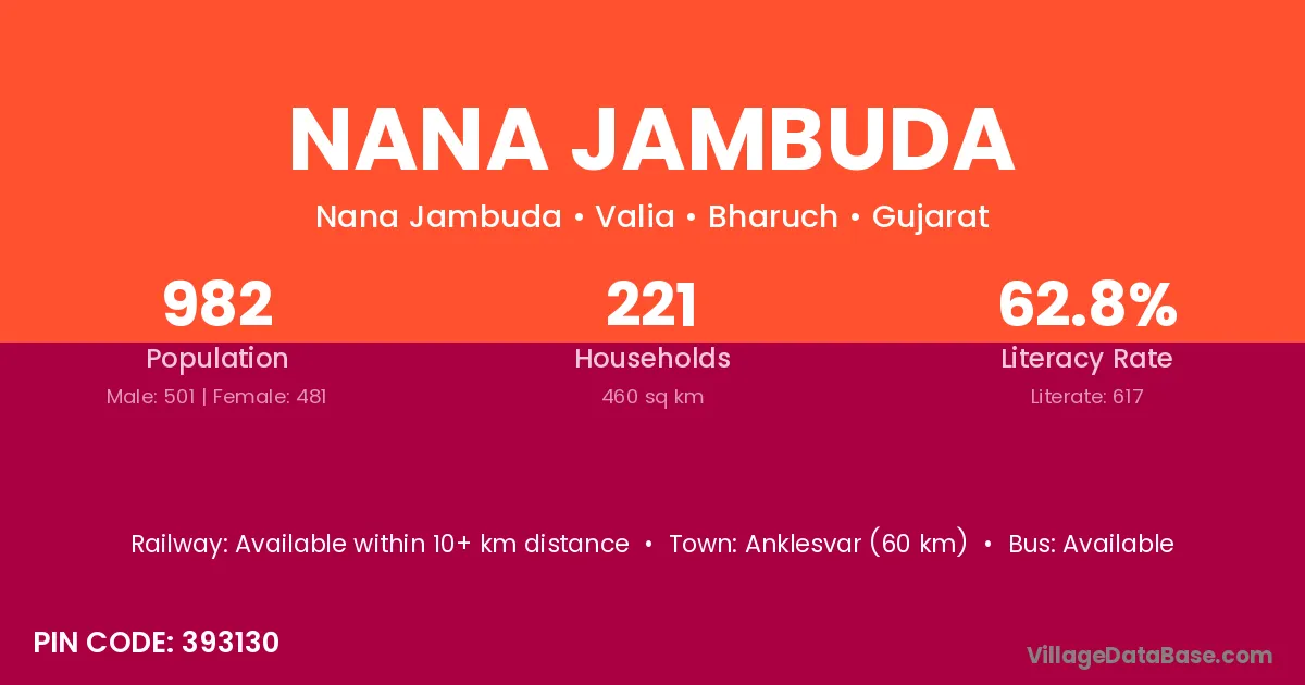 Anklesvar (60 km) is the nearest town to Nana Jambuda village for major economic activities and is located approximately 60 km away.