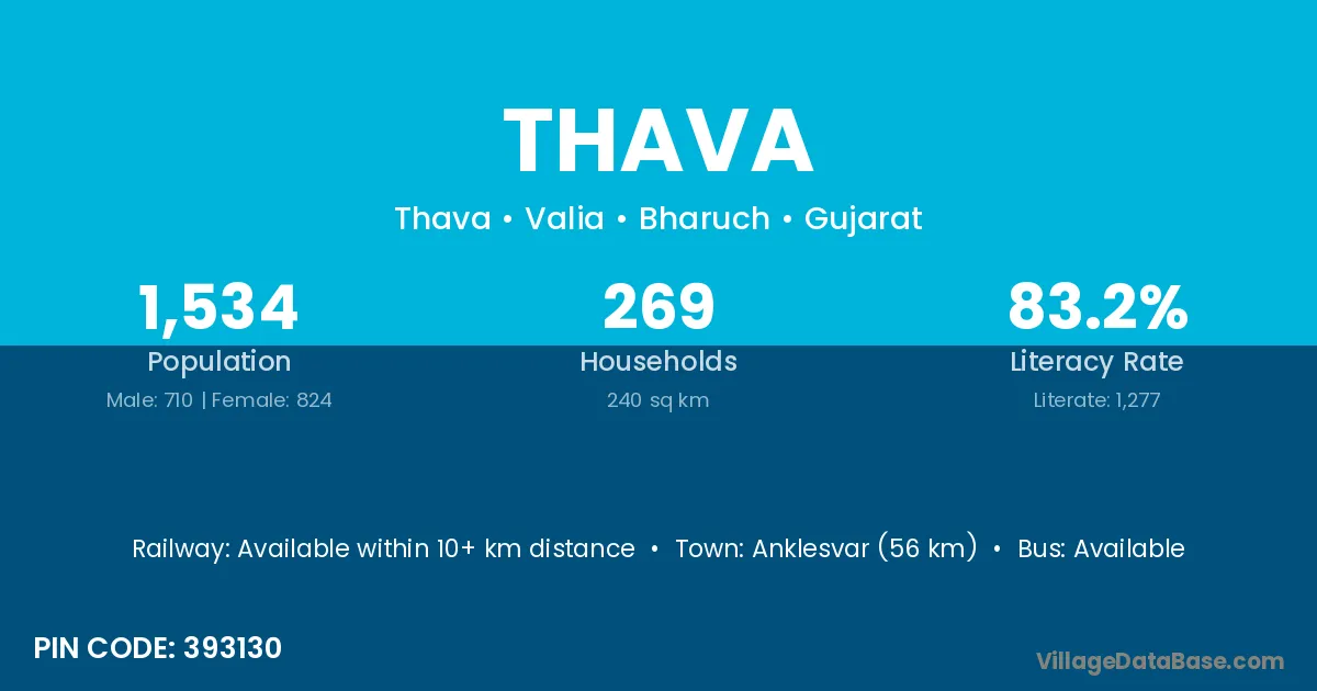 Anklesvar (56 km) is the nearest town to Thava village for major economic activities and is located approximately 56 km away.