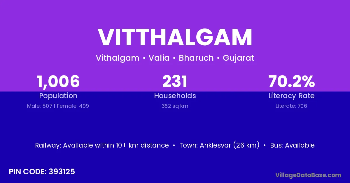 Anklesvar (26 km) is the nearest town to Vitthalgam village for major economic activities and is located approximately 26 km away.