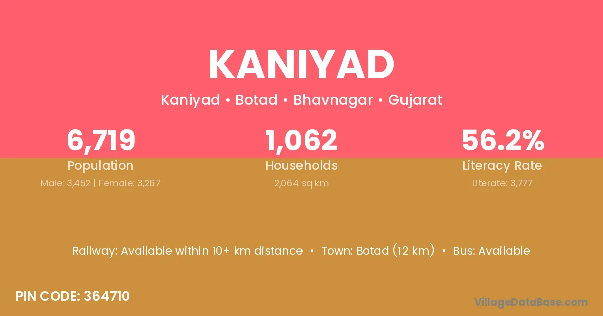 Botad (12 km) is the nearest town to Kaniyad village for major economic activities and is located approximately 12 km away.