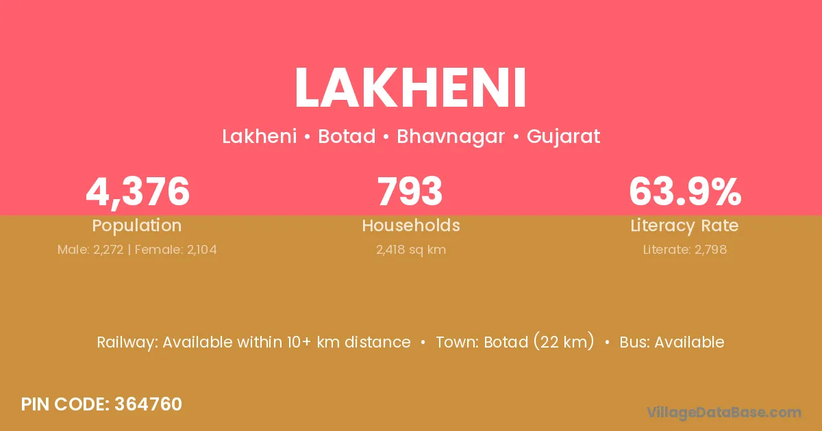 Botad (22 km) is the nearest town to Lakheni village for major economic activities and is located approximately 22 km away.