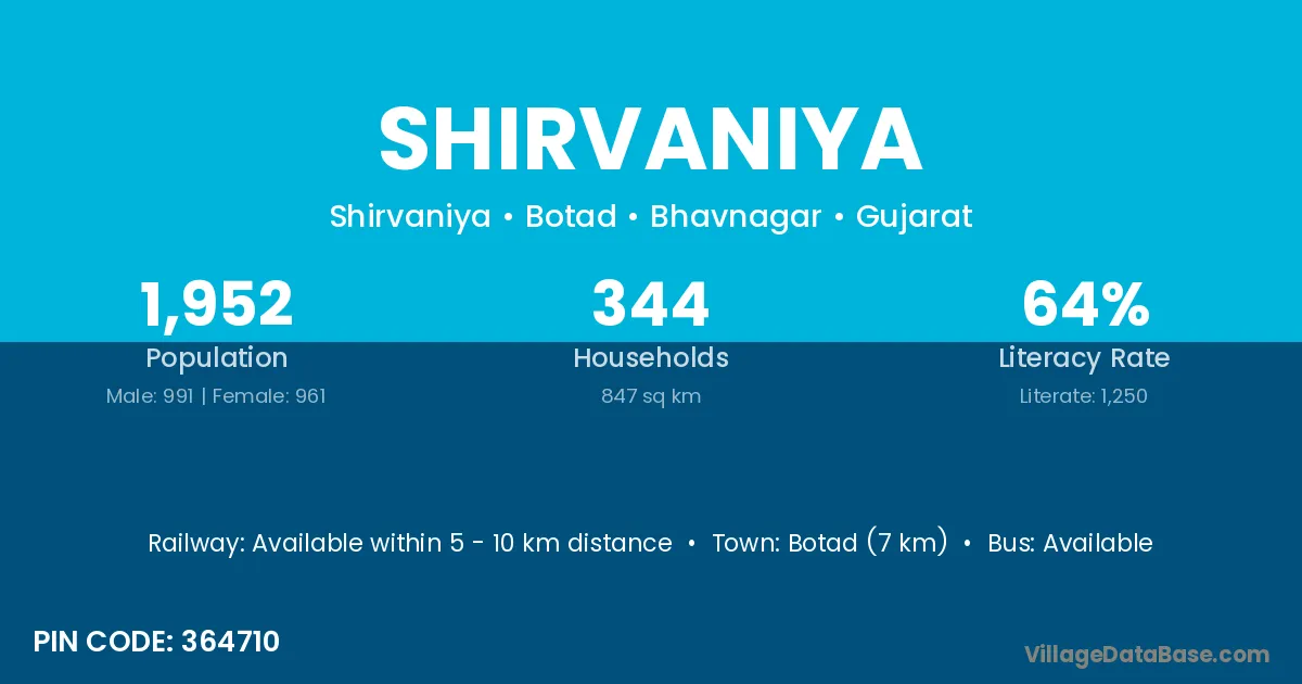 Botad (7 km) is the nearest town to Shirvaniya village for major economic activities and is located approximately 7 km away.