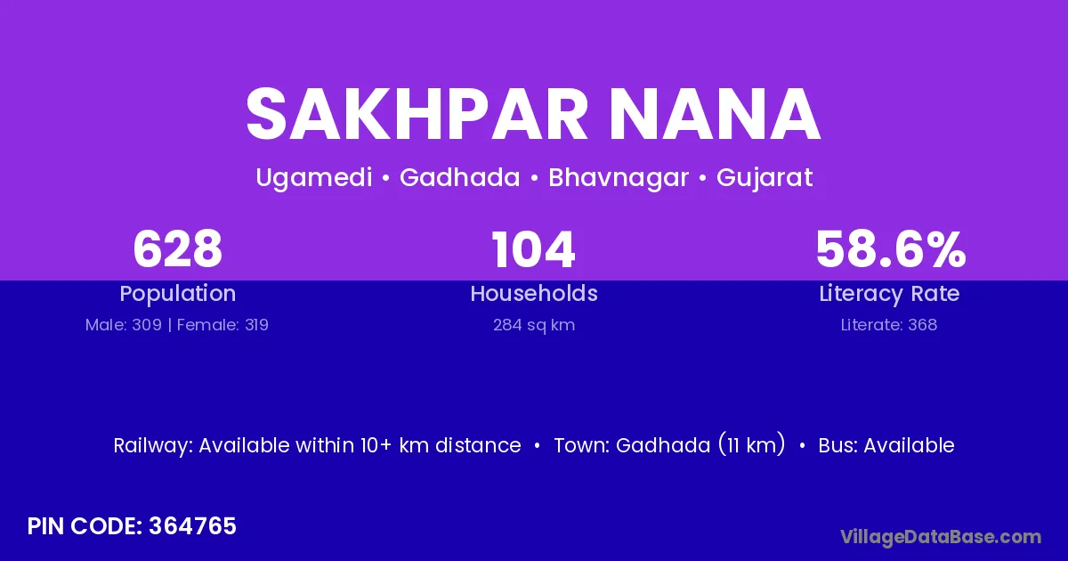 Gadhada (11 km) is the nearest town to Sakhpar Nana village for major economic activities and is located approximately 11 km away.