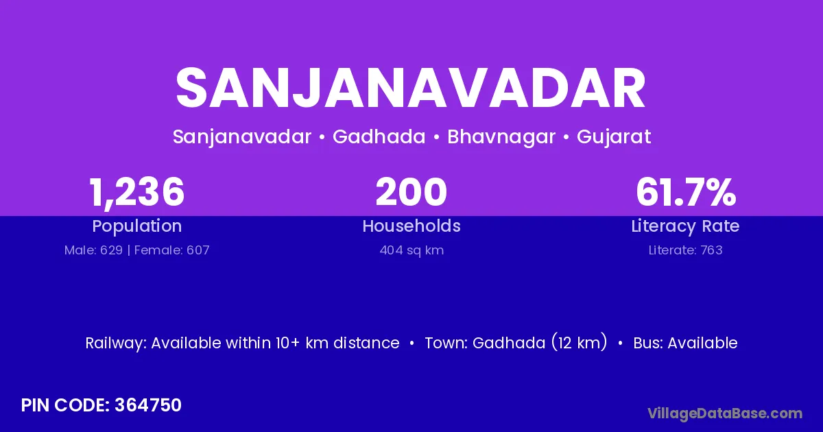 Gadhada (12 km) is the nearest town to Sanjanavadar village for major economic activities and is located approximately 12 km away.