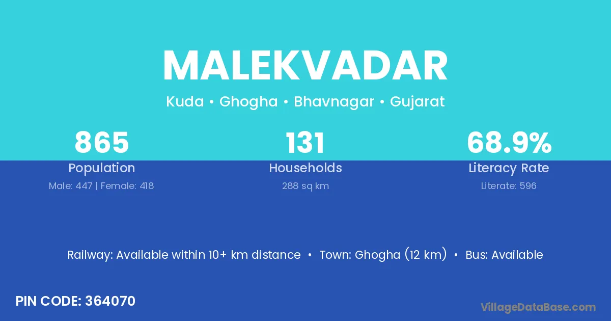 Ghogha (12 km) is the nearest town to Malekvadar village for major economic activities and is located approximately 12 km away.