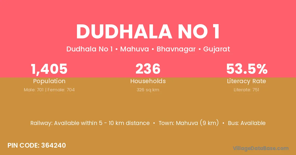 Mahuva (9 km) is the nearest town to Dudhala No 1 village for major economic activities and is located approximately 9 km away.