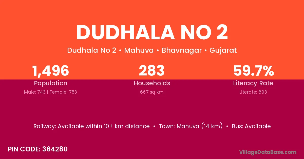 Mahuva (14 km) is the nearest town to Dudhala No 2 village for major economic activities and is located approximately 14 km away.