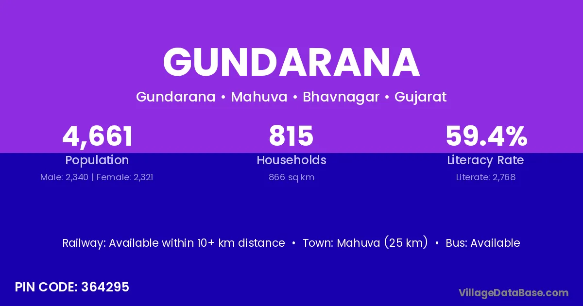 Mahuva (25 km) is the nearest town to Gundarana village for major economic activities and is located approximately 25 km away.