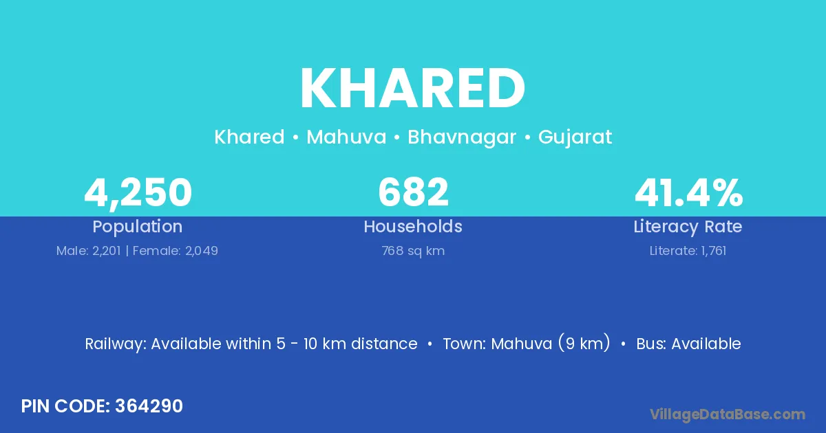 Mahuva (9 km) is the nearest town to Khared village for major economic activities and is located approximately 9 km away.