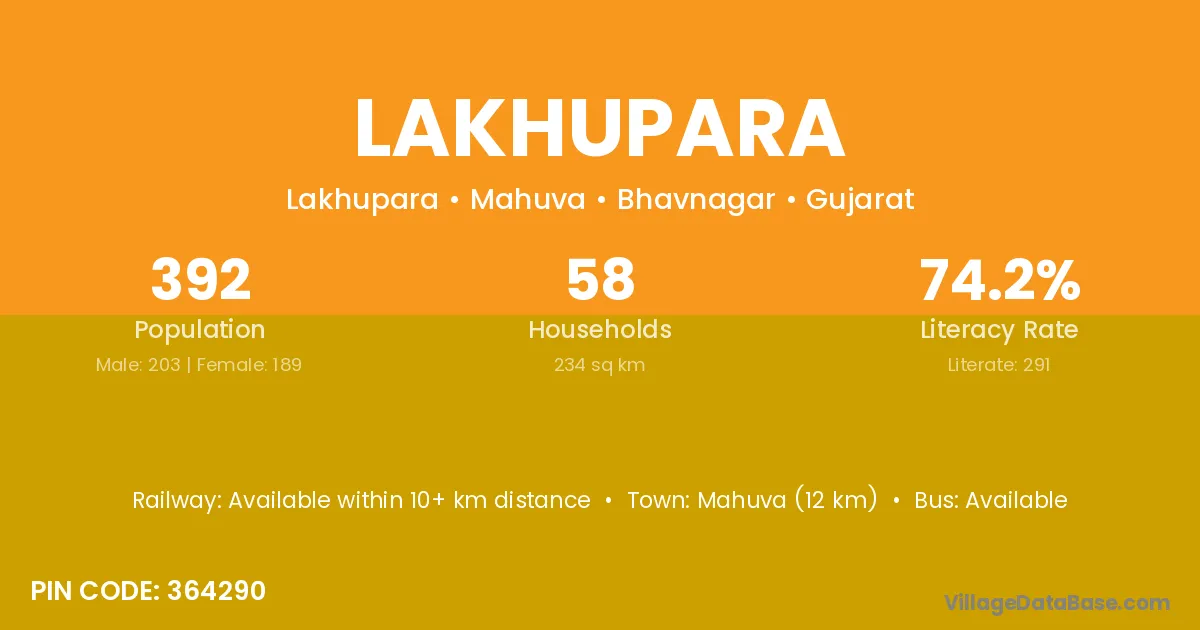 Mahuva (12 km) is the nearest town to Lakhupara village for major economic activities and is located approximately 12 km away.