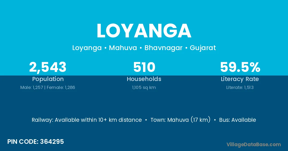 Mahuva (17 km) is the nearest town to Loyanga village for major economic activities and is located approximately 17 km away.