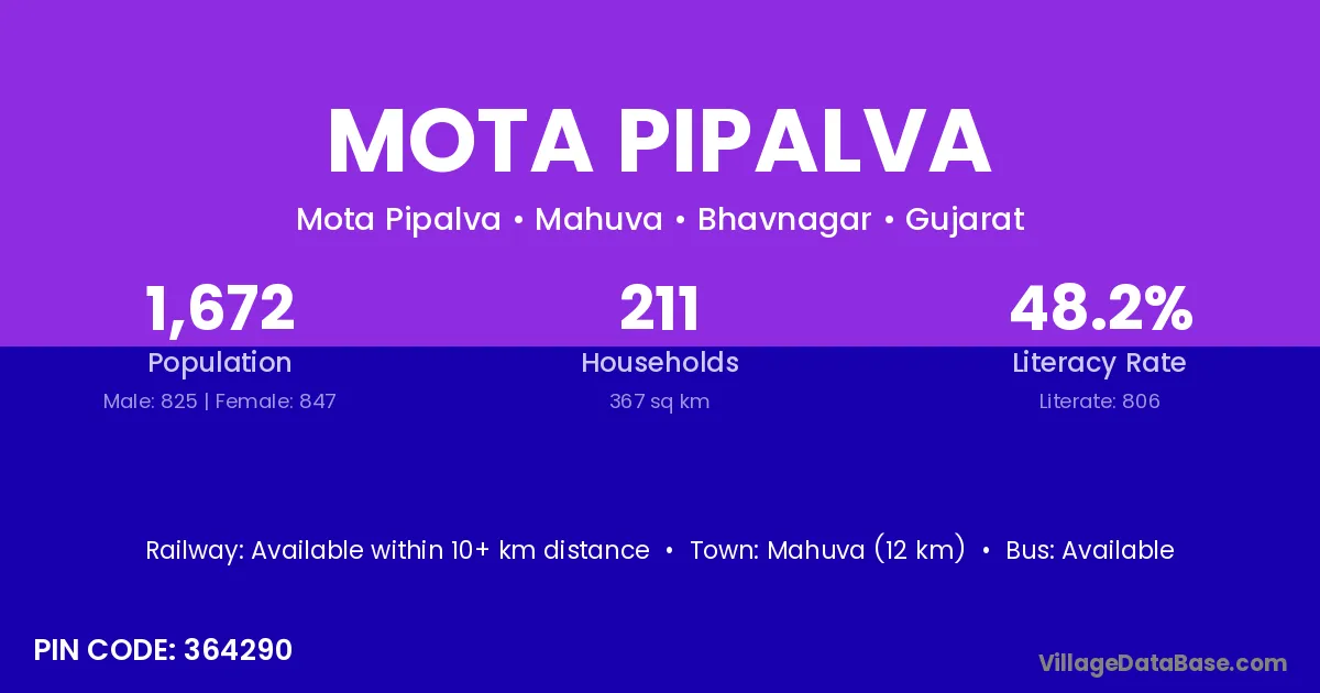 Mahuva (12 km) is the nearest town to Mota Pipalva village for major economic activities and is located approximately 12 km away.