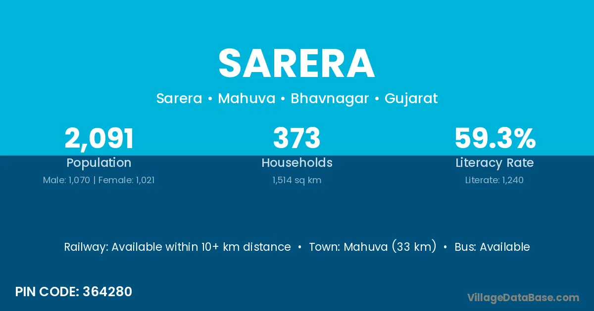 Mahuva (33 km) is the nearest town to Sarera village for major economic activities and is located approximately 33 km away.