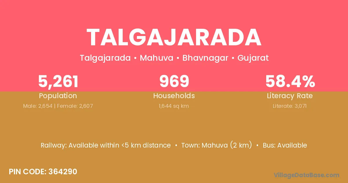 Mahuva (2 km) is the nearest town to Talgajarada village for major economic activities and is located approximately 2 km away.