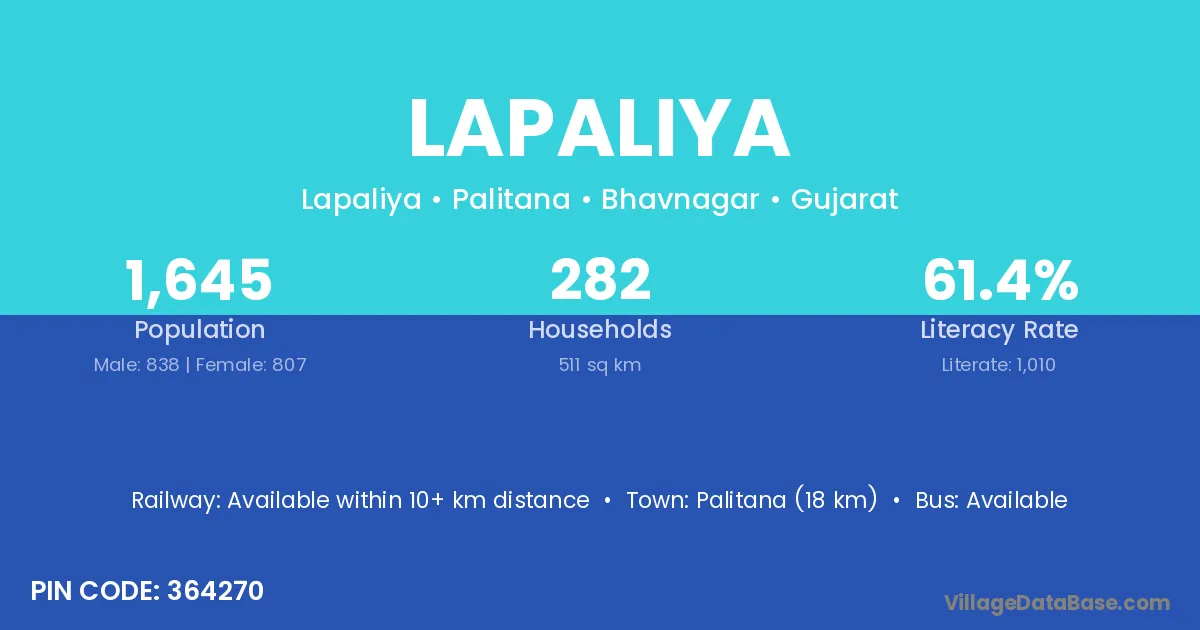 Palitana (18 km) is the nearest town to Lapaliya village for major economic activities and is located approximately 18 km away.