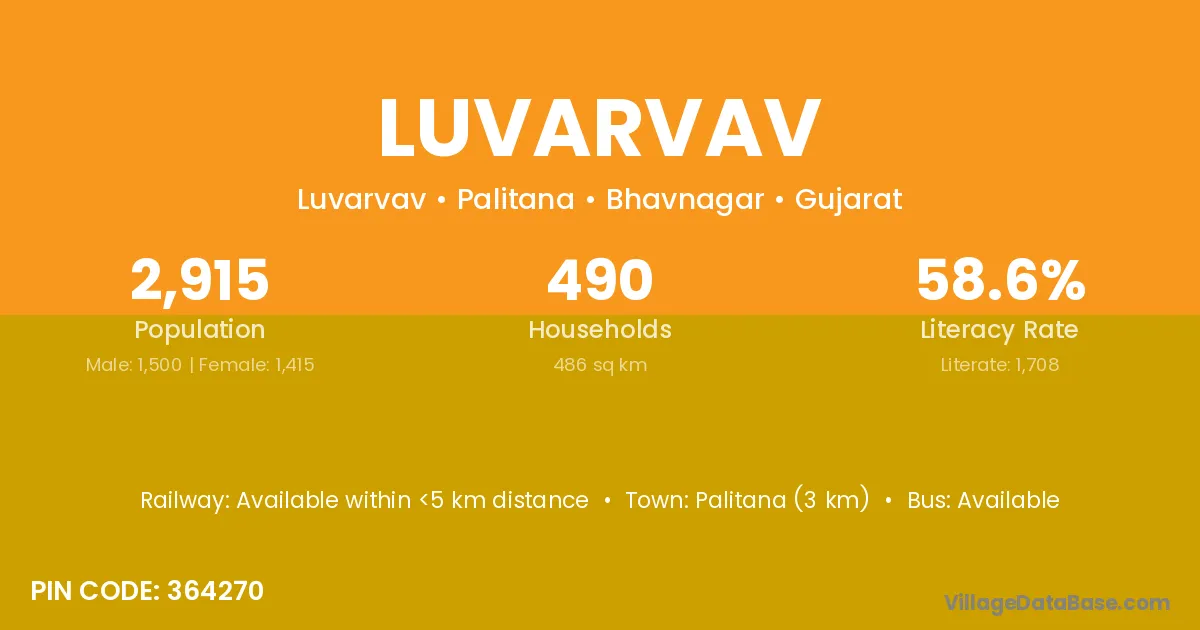 Palitana (3 km) is the nearest town to Luvarvav village for major economic activities and is located approximately 3 km away.