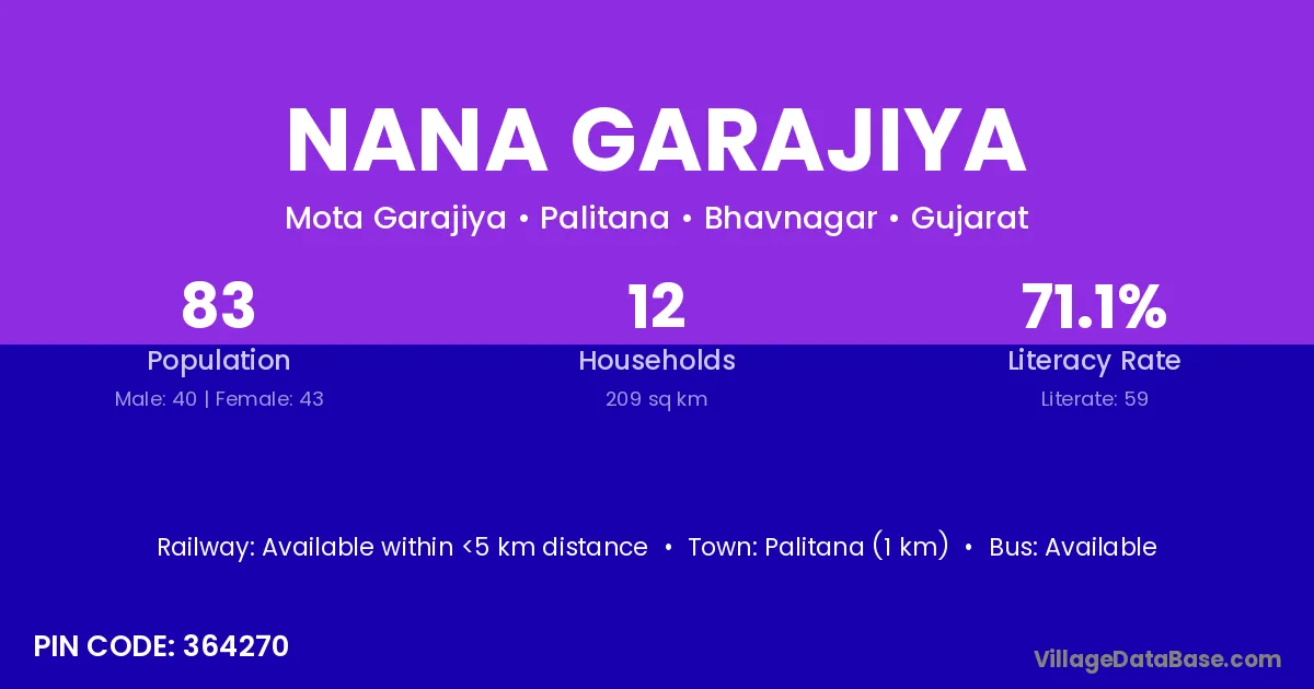Palitana (1 km) is the nearest town to Nana Garajiya village for major economic activities and is located approximately 1 km away.