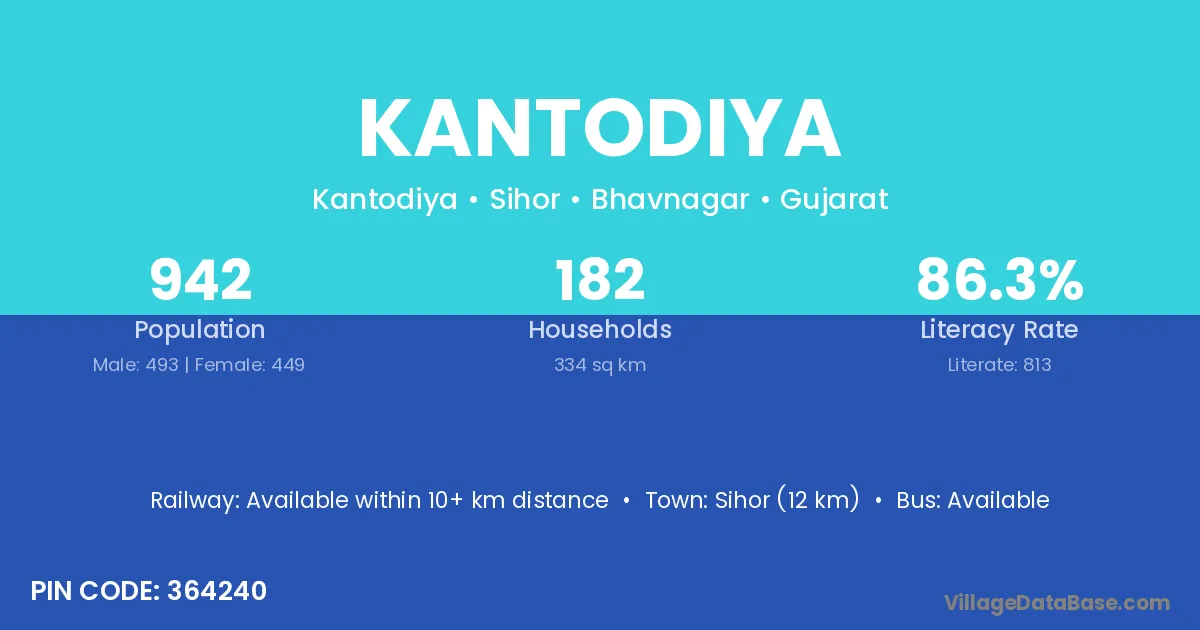 Sihor (12 km) is the nearest town to Kantodiya village for major economic activities and is located approximately 12 km away.