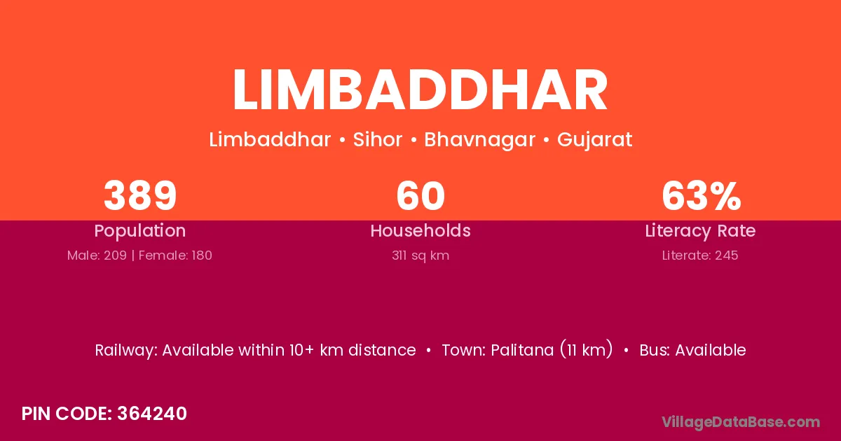 Palitana (11 km) is the nearest town to Limbaddhar village for major economic activities and is located approximately 11 km away.