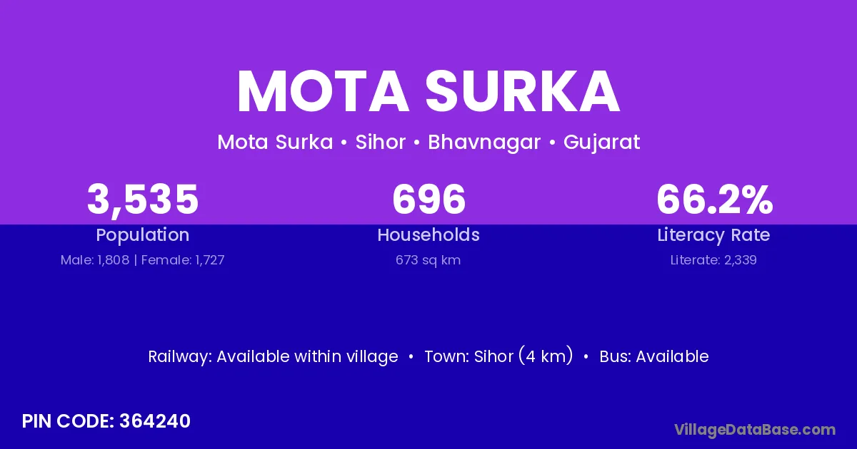 Sihor (4 km) is the nearest town to Mota Surka village for major economic activities and is located approximately 4 km away.