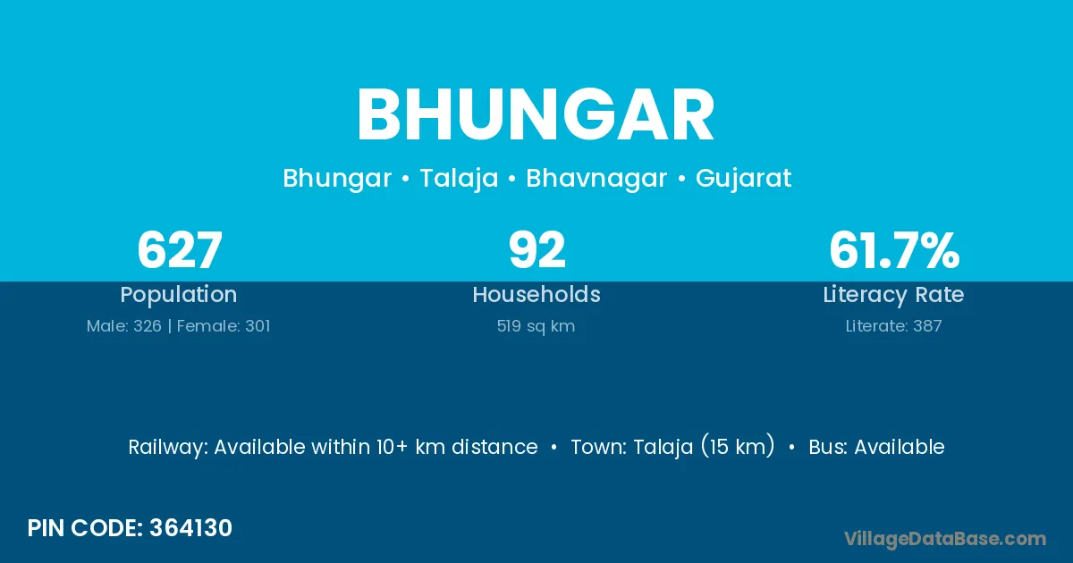Talaja (15 km) is the nearest town to Bhungar village for major economic activities and is located approximately 15 km away.