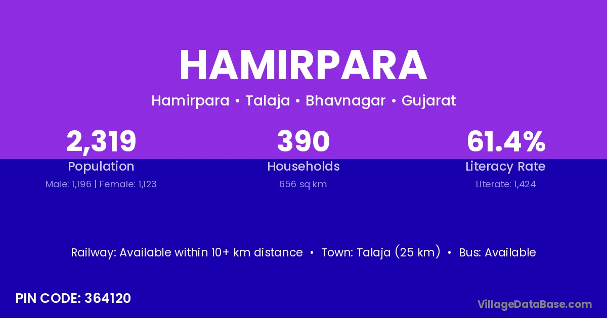 Talaja (25 km) is the nearest town to Hamirpara village for major economic activities and is located approximately 25 km away.