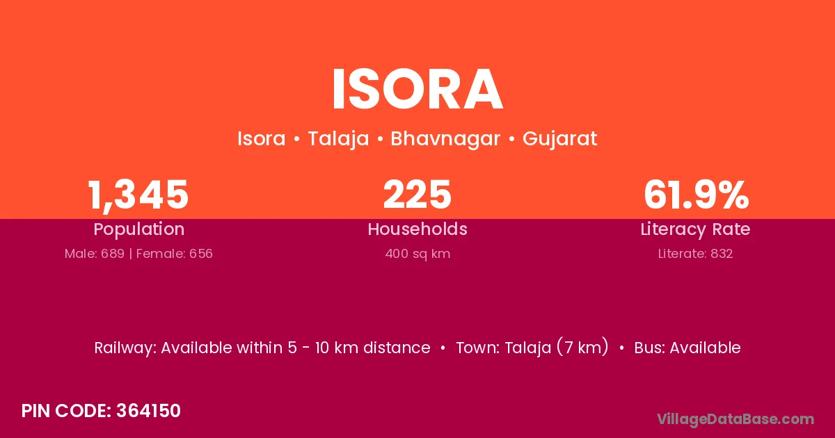 Talaja (7 km) is the nearest town to Isora village for major economic activities and is located approximately 7 km away.