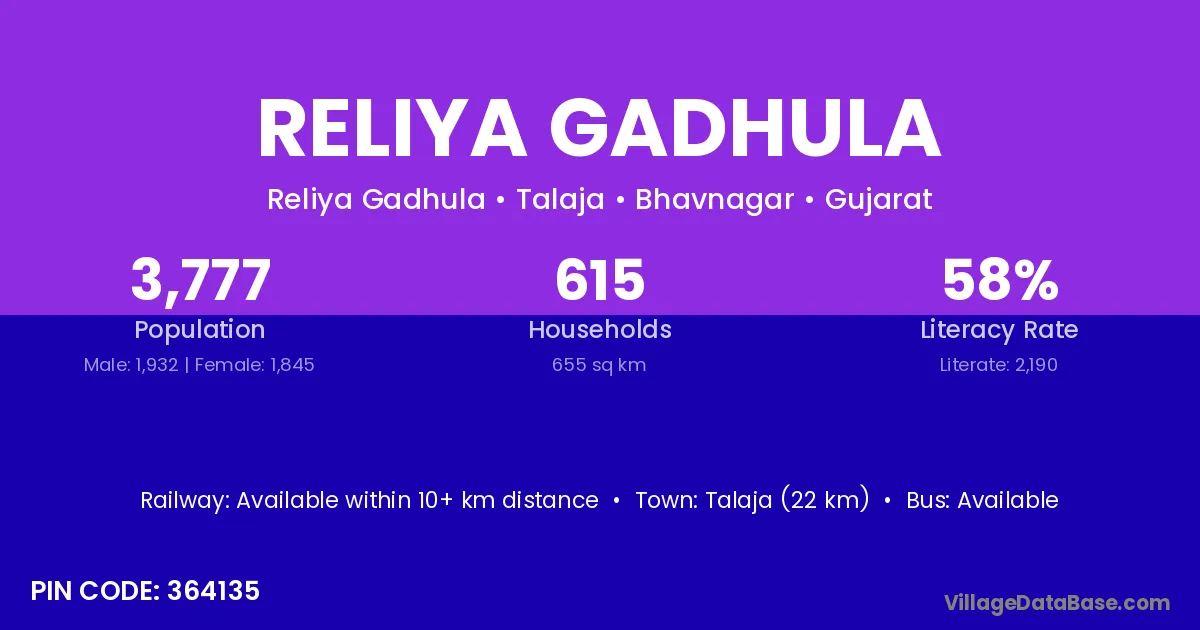 Talaja (22 km) is the nearest town to Reliya Gadhula village for major economic activities and is located approximately 22 km away.
