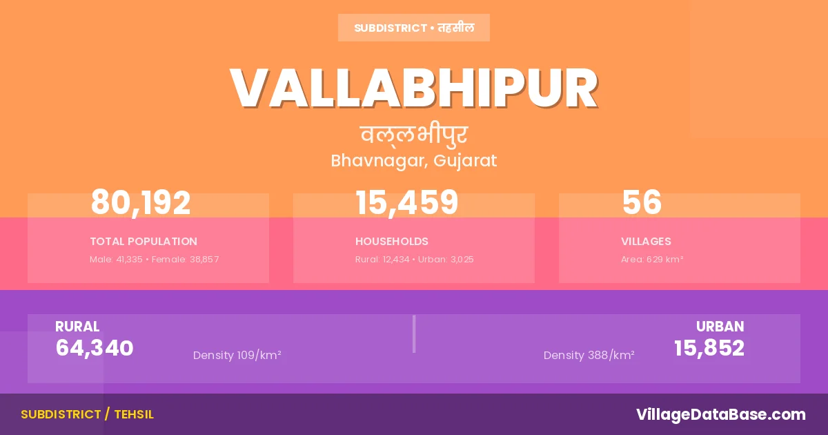 According to the 2011 census The total area of Vallabhipur Taluka is 629 km², with a population of 80192 people. The population density is 127 inhabitants per square kilometre, and there are approximately 15459 houses in the sub district.