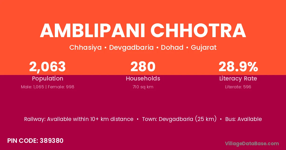 Devgadbaria (25 km) is the nearest town to Amblipani Chhotra village for major economic activities and is located approximately 25 km away.