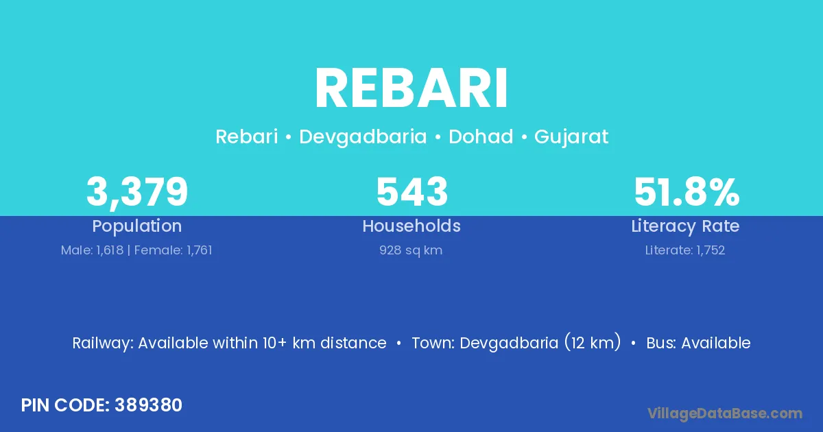 Devgadbaria (12 km) is the nearest town to Rebari village for major economic activities and is located approximately 12 km away.