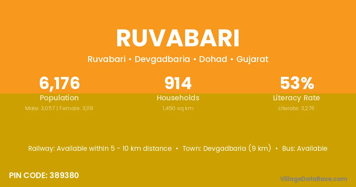 Devgadbaria (9 km) is the nearest town to Ruvabari village for major economic activities and is located approximately 9 km away.