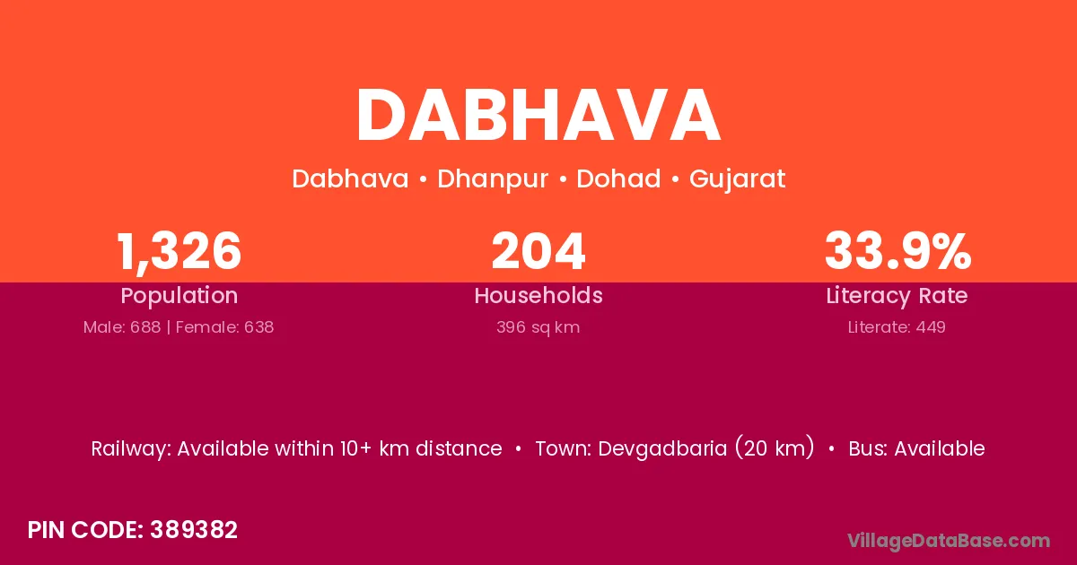 Devgadbaria (20 km) is the nearest town to Dabhava village for major economic activities and is located approximately 20 km away.