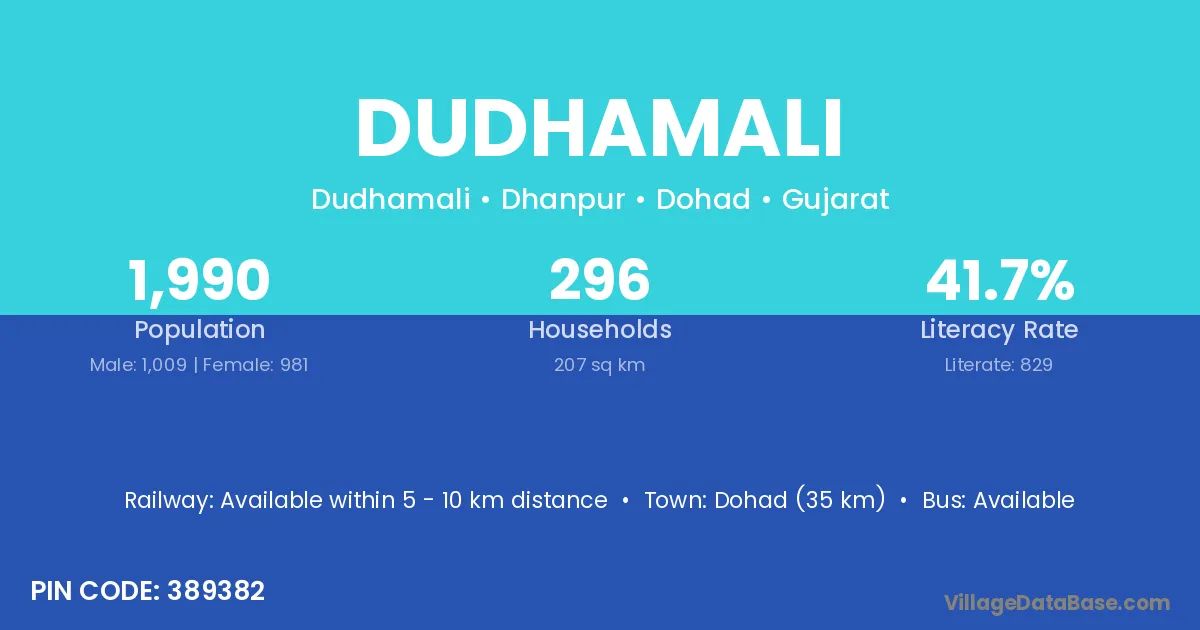 Dohad (35 km) is the nearest town to Dudhamali village for major economic activities and is located approximately 35 km away.