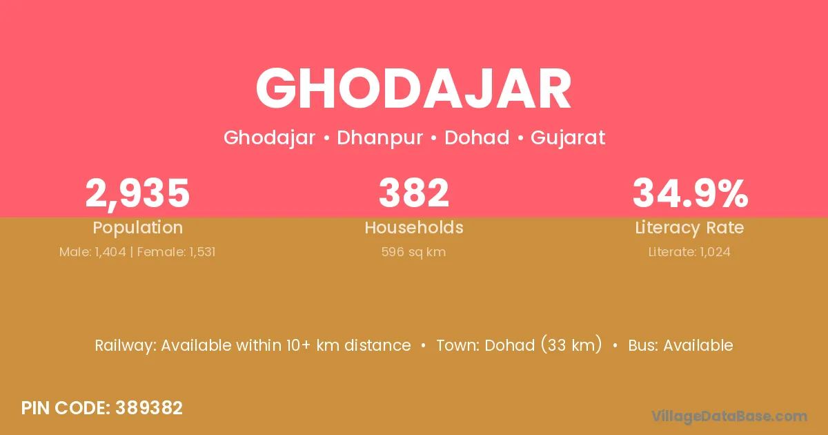 Dohad (33 km) is the nearest town to Ghodajar village for major economic activities and is located approximately 33 km away.