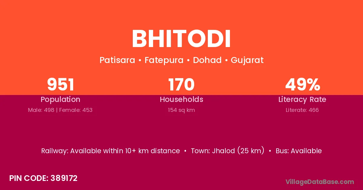 Jhalod (25 km) is the nearest town to Bhitodi village for major economic activities and is located approximately 25 km away.