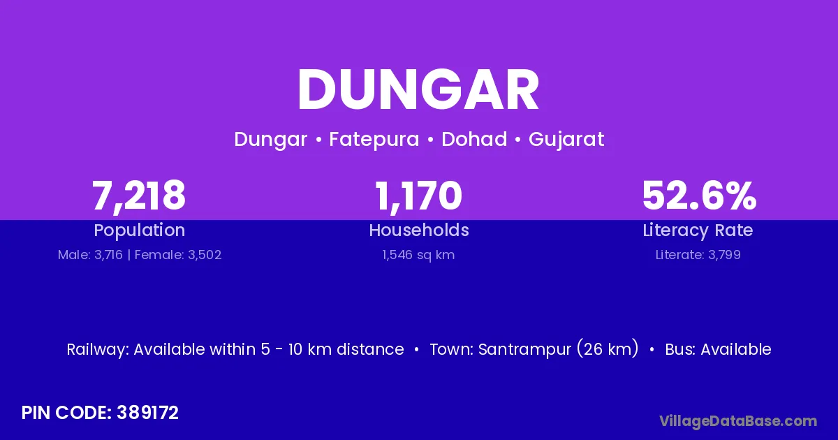Santrampur (26 km) is the nearest town to Dungar village for major economic activities and is located approximately 26 km away.