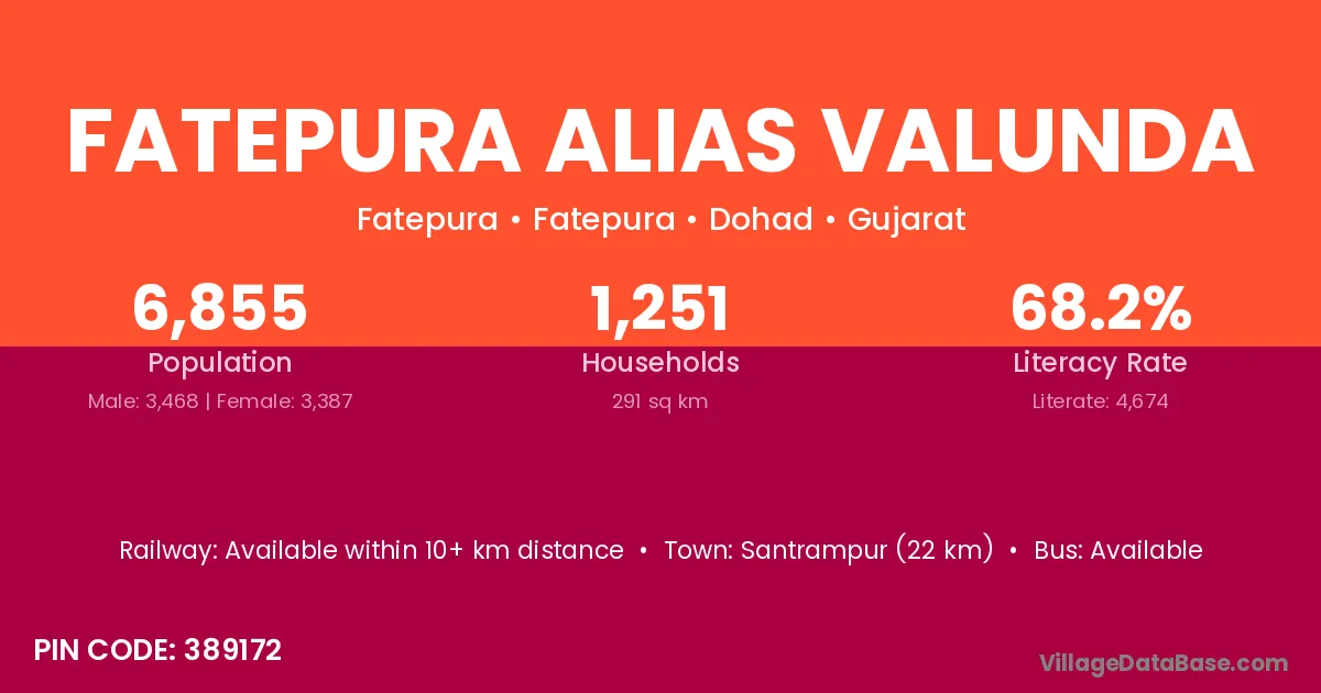 Fatepura Alias Valunda village has a total population of 6,855 people, of which 3,468 are males and 3,387 are females.