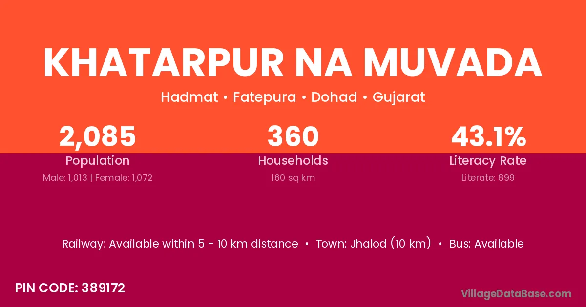 Khatarpur Na Muvada village has a total population of 2,085 people, of which 1,013 are males and 1,072 are females.