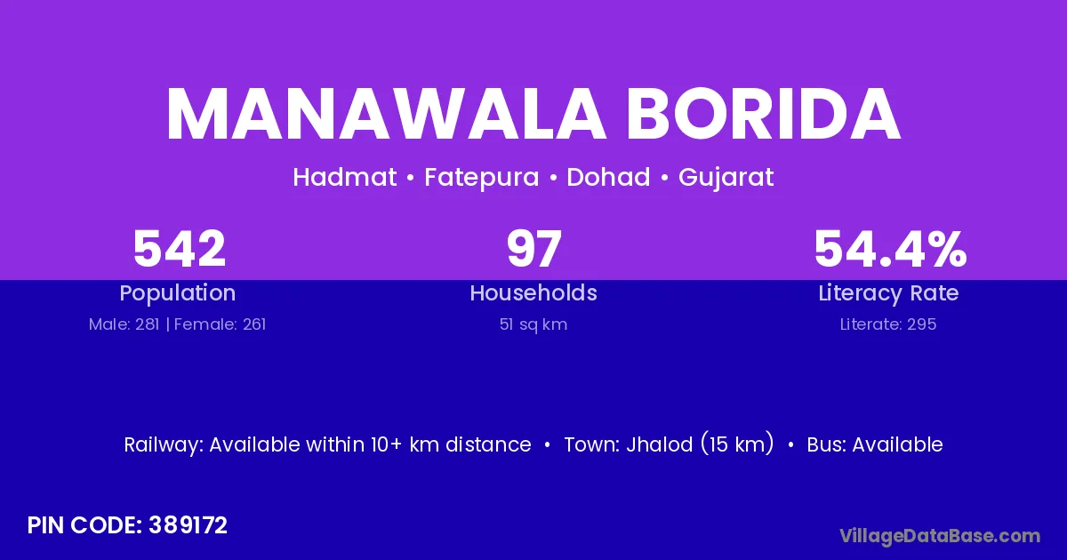 Jhalod (15 km) is the nearest town to Manawala Borida village for major economic activities and is located approximately 15 km away.