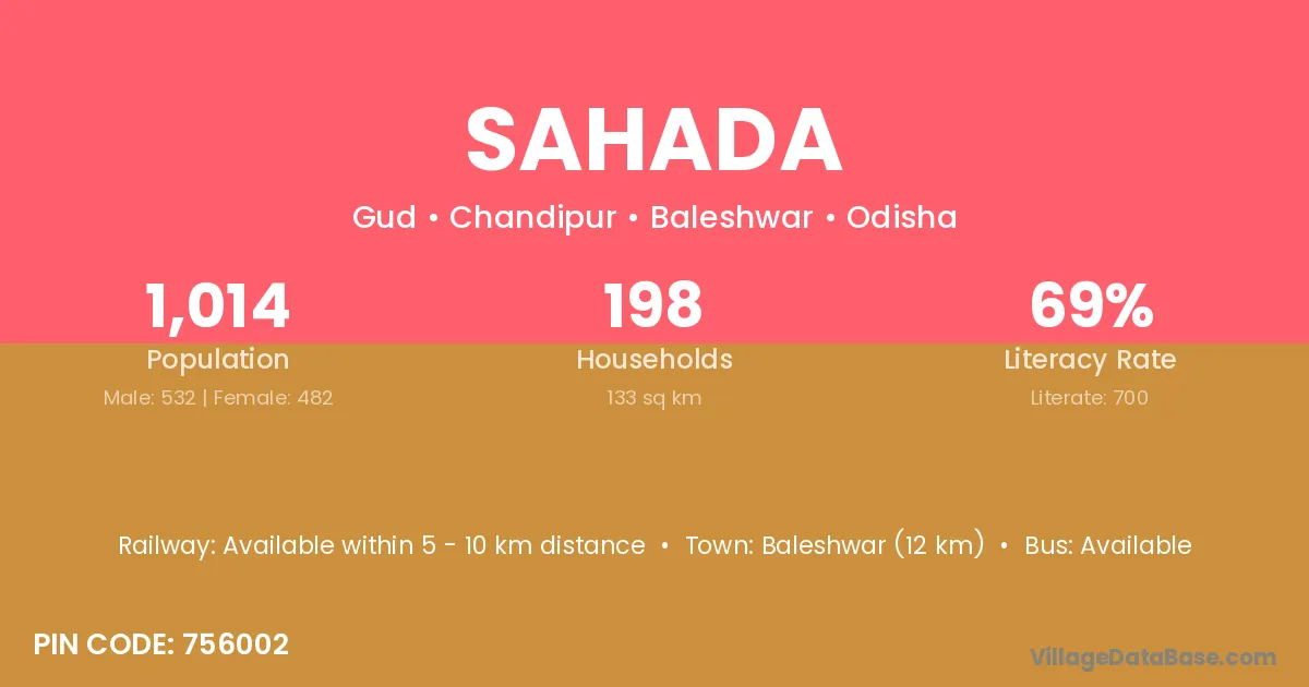 Sahada village has a total population of 3,858 people, of which 1,959 are males and 1,899 are females.