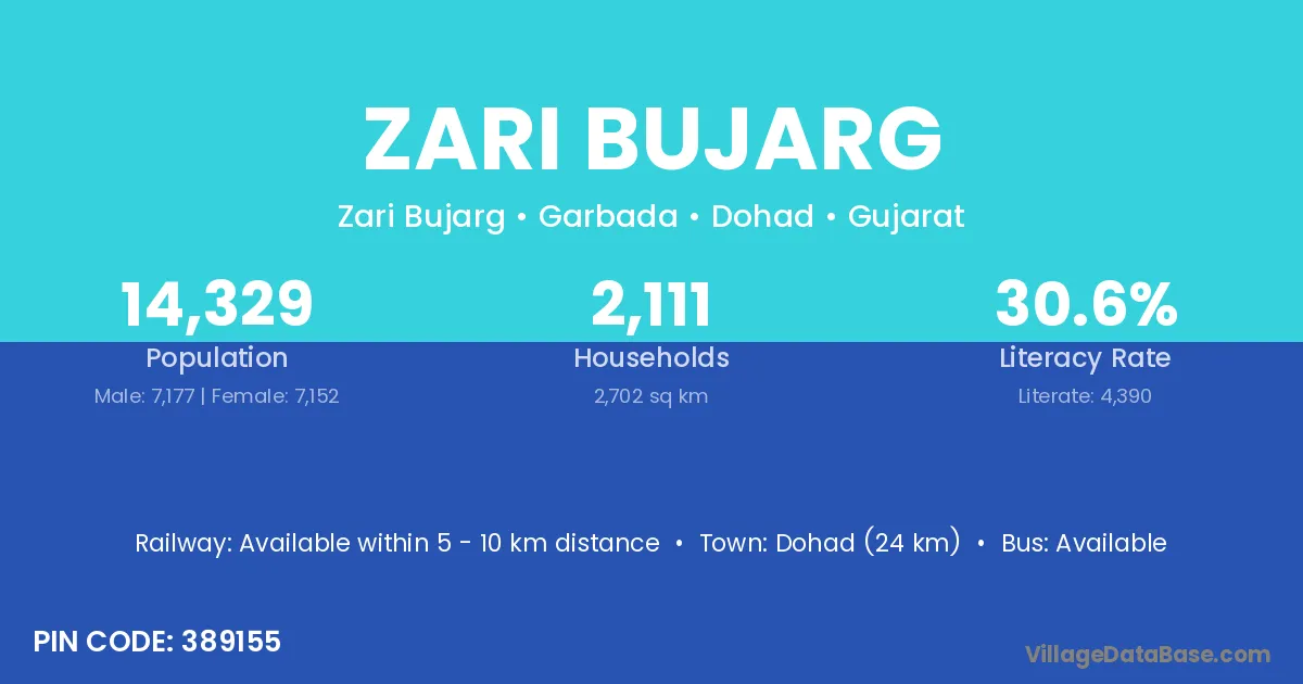 Dohad (24 km) is the nearest town to Zari Bujarg village for major economic activities and is located approximately 24 km away.