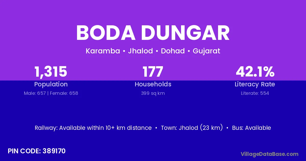 Jhalod (23 km) is the nearest town to Boda Dungar village for major economic activities and is located approximately 23 km away.