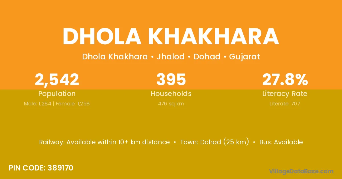 Dohad (25 km) is the nearest town to Dhola Khakhara village for major economic activities and is located approximately 25 km away.