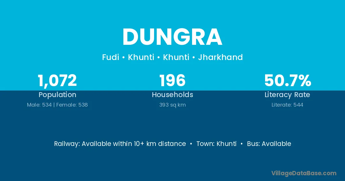 The literacy rate of Dungra village is 59.16%. Male literacy stands at 66.72% and female literacy at 50.96%.